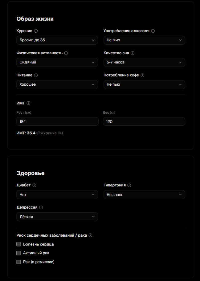 Тема сложная. Мне 37 лет, и я до сих пор не уверен что понял и принял одну простую вещь — в лучшем случае осталась половина. В лучшем. А калькулятор мне выдал 57. Базовая для России — 68, а у меня минус 11.5 лет сверху. BMI забрал сразу 8 лет. Физическая активность — минус 3. Сидячий образ жизни — ещё минус 2. Стресс, оптимизм, курение, давление, депрессия — по минус единичке‑полторе каждый. И вот ты смотришь на этот список и думаешь — ну ладно, спортом мне надо заняться, это я и так знал. Но что BMI настолько бьёт — я честно не ожидал.