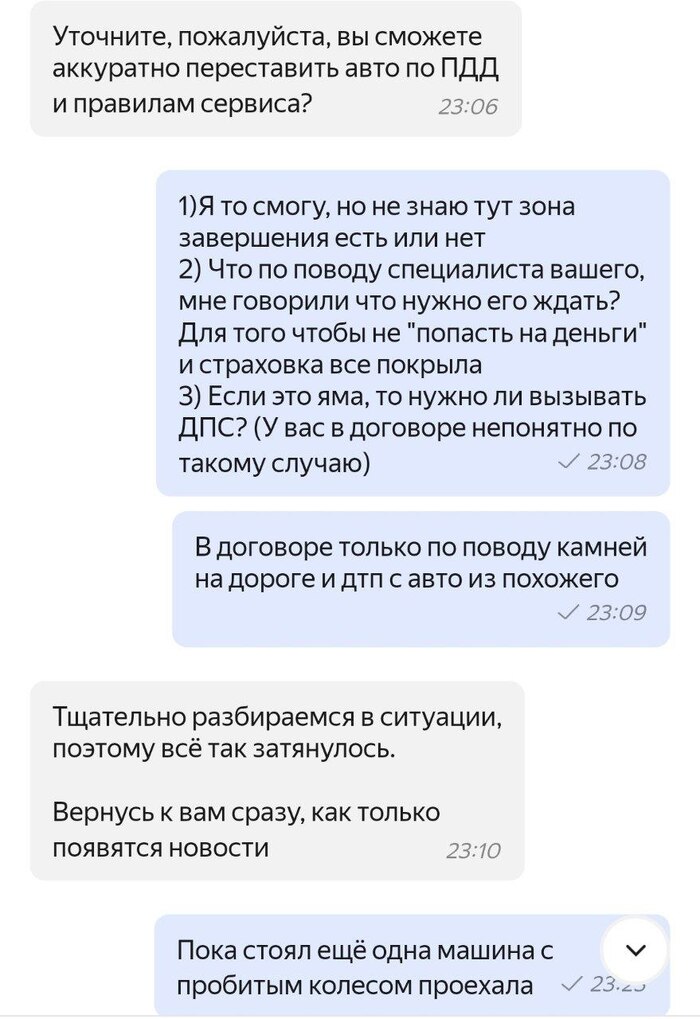 Сегодня же я получил звонок, где мне сказали что оператор был не прав, но при всех моих попытках добросовестных урегулировать ситуацию когда она случилась, я все равно должен заплатить штраф за покрышку и диск (он был целый внешне). Мне сказали что оказывается страховка мою ситуацию не покрывает (в поддержке сказали что покрытие есть), и что в таком случае списание будет всегда. На мои возражения что я действовал точно по инструкции арендодателя, что почему не сказали сразу о том что нужно все же дпс вызывать и тогда я бы уже решал проблему с Автодором требуя компенсацию за яму не по ГОСТУ(раз страховка оказывается это не покрывает), и попытку договориться как-то ответили что нужно подавать жалобу и по итогу было сказано что будут подавать на меня в суд. Попытался после этого, спросить можно ли как-то договориться, но как только я начал что-то говорить сотрудник сразу же бросил трубку.