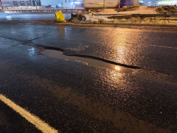 Пока мы общались по телефону в яму попало еще одно авто и пробило колесо, я пошел и сфоткал яму.