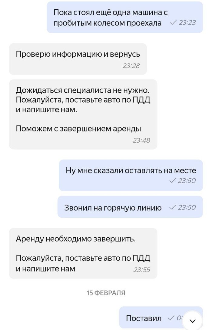 После разговора я перевёл автомобиль в режим ожидания. При этом аренда со стороны поддержки своевременно завершена не была, и мне пришлось дополнительно написать в чат для её завершения. "