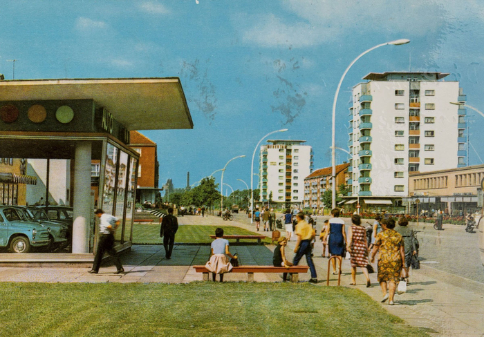 Жилой комплекс №4 закончили строить в 1964-м. Дальше архитектура стала попроще. Не случайно, что ЖК №7, построенный во второй половине 1980-х на окраине города, был почти полностью снесен к 2009 году. Причина сноса: слишком много покинутых, заброшенных квартир. Именно отсюда наиболее активно уезжали люди после объединения Германии. Выглядело там все примерно так: