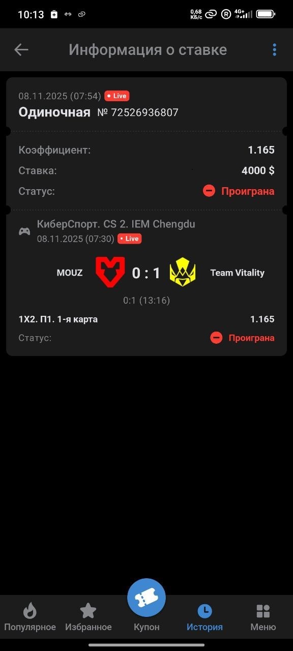 Но судьба решила вновь сыграть в злую шутку: в полуфинале турнира Intel Extreme Masters Mouz (немцы) и Team Vitality (французы) на карте Nuke, первая команда вела со счётом 9:3 за контртеррористов. В итоге проиграла на дополнительных раундах 13:16 вместе с моей ставкой (ну куда же без этого). Было сегодня.