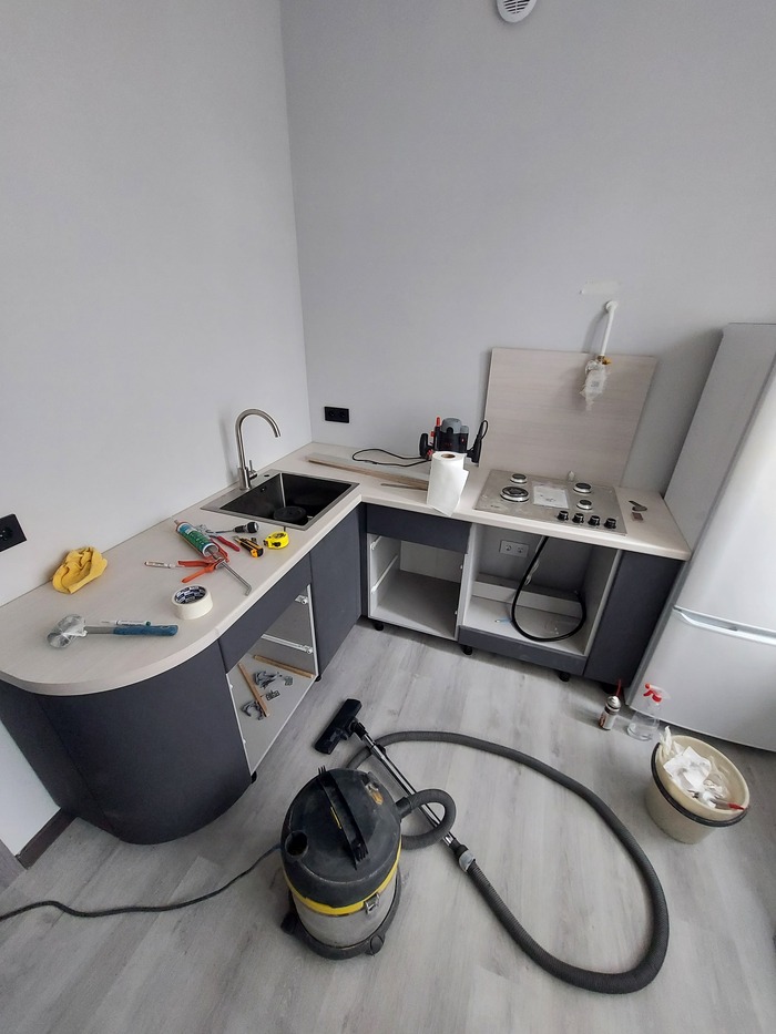 Кухню начал в новогодние каникулы этого года. Вынесено около 20 мешков мусора по 25 кг. Да, я тщательно всё взвешивал, чтобы не убиться в процессе.