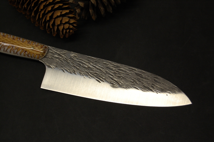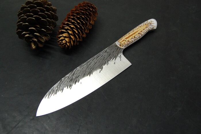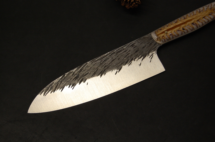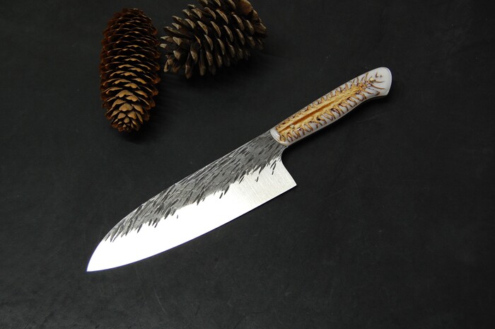 Клинок выполнен из стали AUS10co 2,5 мм. По форме что то похожее на японское сантоку. На голомени клинка фактура ковки для антуража и красивого внешнего вида ножа. Ну еще наверное продукты меньше прилипают к такой неровной поверхности. Спуски прямые, высокие. Сведение примерно 0,1-0,2 мм.