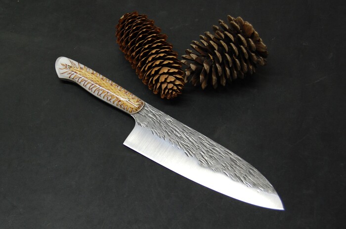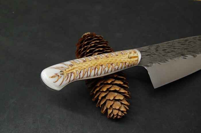Теперь про новую работу в виде кухонного ножа с очень интересным исполнением рукояти.