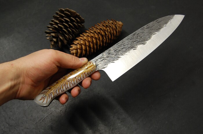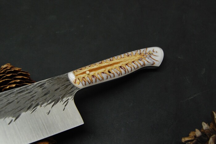 Вообще изготовление рукоятей ножей с такими материалами это всегда рулетка, так как шишка это естественный материал и она склонна к разбуханию в воде. Тем более на кухонном ноже который чаще других будет мыться. Есть мастера кто делает просто - монтирует рукоять чисто из такого гибрида. Это когда еловую красивую большую шишку подготавливают и заливают акрилом, чаще цветным. После разрезают и монтируют сердцевиной наружу. Вопрос долговечности такого материала очень острый, так как шишка контактирует с водой, тем более моющими средствами, которые вымывают защитные составы(пропитки) и со временем начинает жить своей жизнью и постепенно рукоять разрушается. Начинаются сколы и трещины. Необходим ремонт а зачастую и полная замена. Но такая рукоять очень красивая, на мой взгляд естественно. Внешний вид очень приятный.