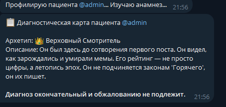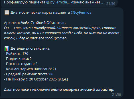 Нашел в телеге забавного бота, который ставит "диагноз" по профилю Пикабу. Решил проверить админа