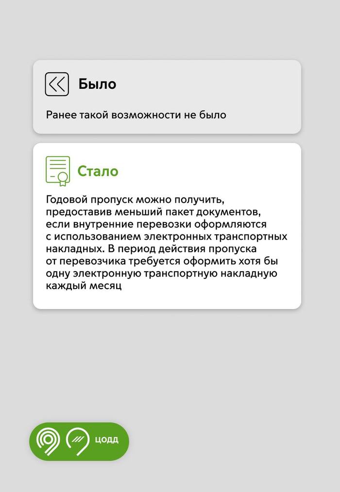 1️⃣ Внедрили электронные перевозочные документы в процесс получения годовых пропусков. Получить грузовой пропуск проще, если оформляете электронные транспортные накладные.