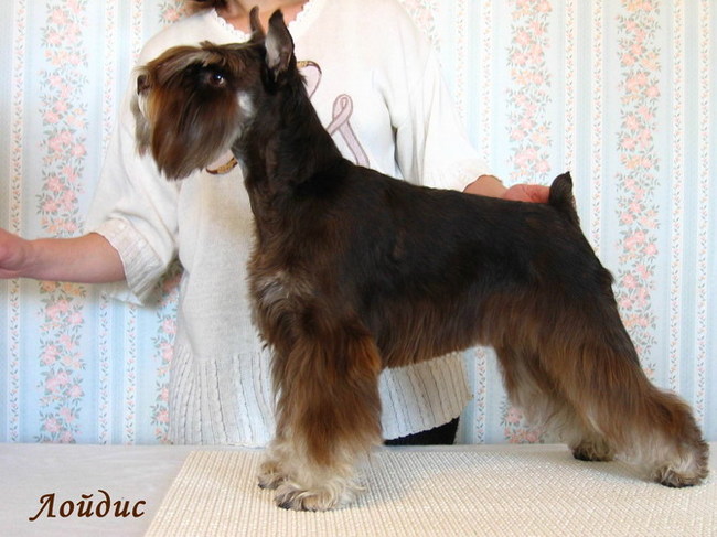 Лойдис (Россия), шоколадно-подпалого окраса. Международная кинологическая федерация не регистрирует шоколадных собак, полагая, что он получен путем метизации и не характерен для шнауцеров, однако ряд стран (и Россия в их числе) регистрирует таких собак в национальных кинологических федерациях, выдает родословные и допускает к участию в выставках. Впервые помёт коричнево-подпалых цвергшнауцеров был получен в 1994 году в Чехии и сейчас невозможно достоверно установить, является ли данный окрас результатом генетической мутации или метизации с собакой другой породы.