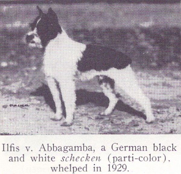 Ilfis v. Abbagama (1929 г.р.) чёрно-белого окраса. Как указывалось выше - несвойственные шнауцерам окрасы появились после прилития кровей других пород. Некоторое время подобные собаки, обладающие отличным экстерьером использовались в разведении и даже были признаны в 1929 году, однако в 1933 году был введен полный запрет на использование цветных собак.