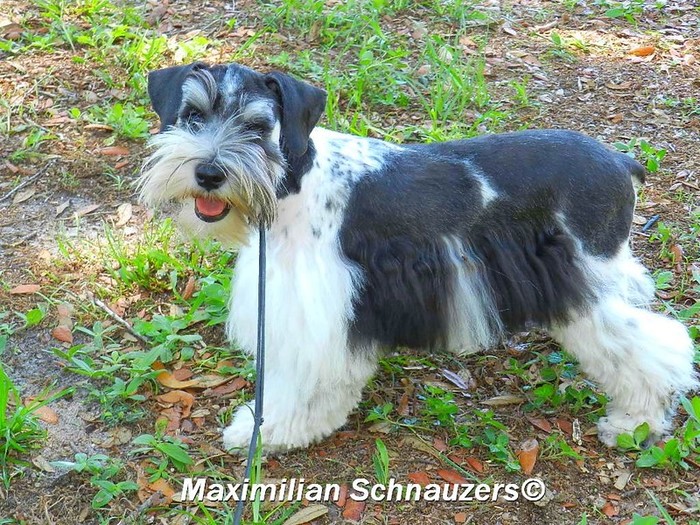 Разводя собак подобных окрасов, американцы вспоминают пятнистых цвергшнауцеров начала XX века (в начале поста я показывала пятнистую собаку того времени). Однако, поскольку селекция по избавлению от пятнистого окраса в породе шла более семидесяти лет, а цветные собаки в США стали появляться с началом моды на необычные окрасы, логично считать что подобные собаки - результат метизации с другими породами - шелти, длинношерстные таксы, американские кокер-спаниели. В пользу этого говорит так же и качество шерсти - слишком длинная и даже визуально - мягкая.