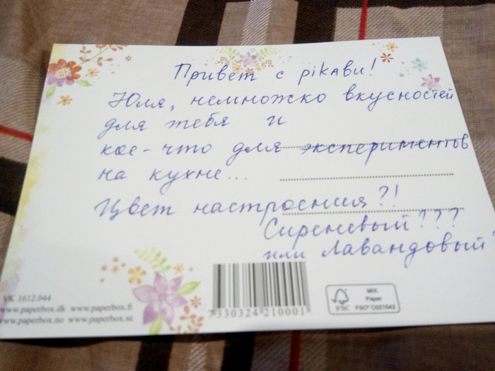 Первый раз участвую в обмене подарками. Интересно конечно собирать подарок для незнакомого человека. Своей получательнице посылку отправила, стала ждать свою. И вот наконец-то!!!!! долгожданное сообщение с трек-кодом! Но прошла неделя-вторая-третья, а посылка нигде не отслеживалась.... Написала в администрацию проекта - сказали жать кнопку Подарок не получен..... жму.... время идет, в жизни много перемен (свадьба, далее отдых на море). И тут приходит сообщение, что трек-код указали неверно и моя посылка уже две недели лежит на почте. Отдельное спасибо Укрпочте - ни единого уведомления!(