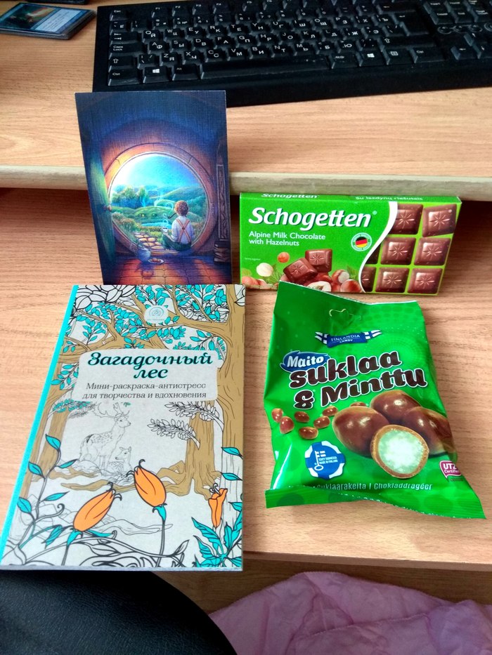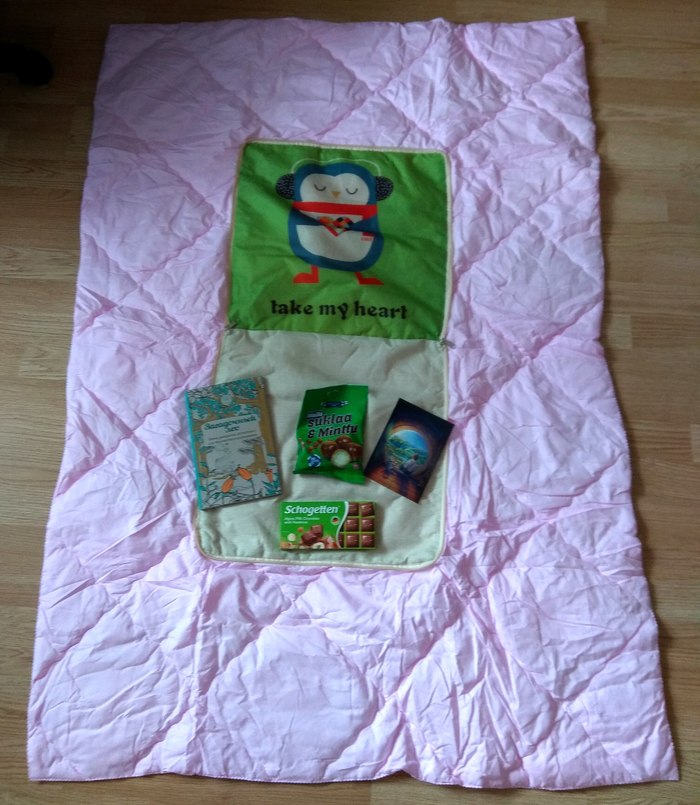 А в подушке - вкусняшки (вкуснючая шоколадка и очень оригинальные конфеты - мята в шоколаде, никогда таких не ела), открытка и раскраска антистресс (о да! я ворона - всё перепутала. Я решила, что её мне в обмене головоломками прислали, а она в другом проекте была. Сегодня посмотрела фотографию, сделанную сразу после получения, и осознала в очередной раз - я растяпа. Эх! Надо сразу всё фотографировать.)