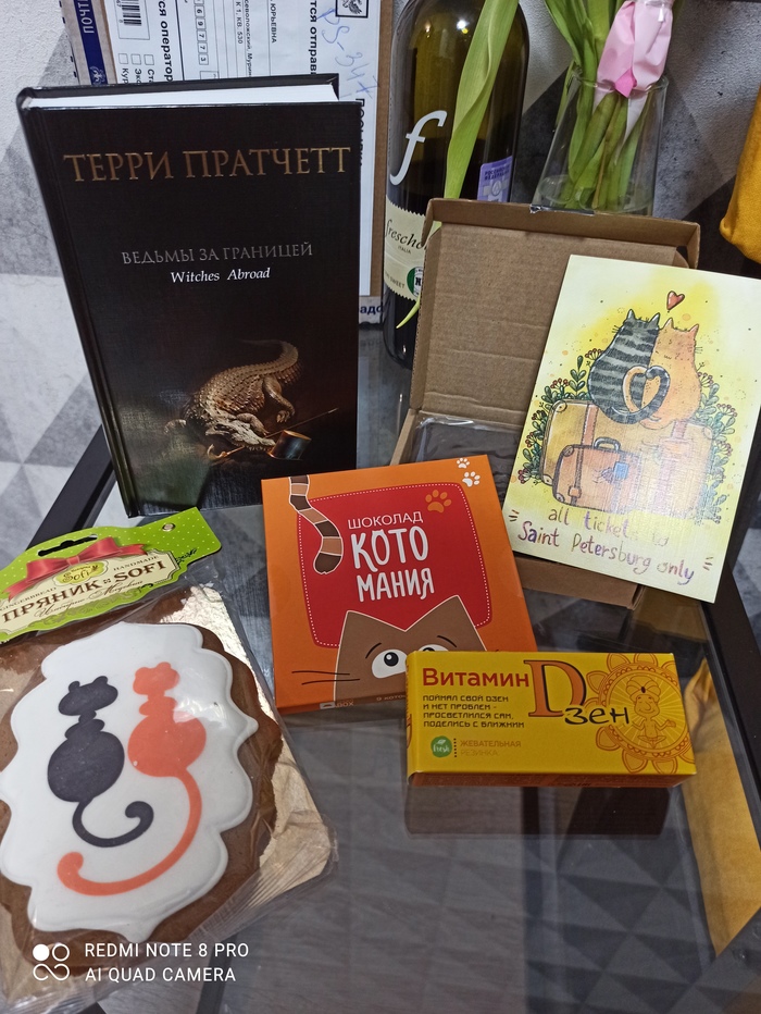 Вот и до меня добралось моë оранжевое настроение))) Посылочка порадовала котооткрыткой, котопряником и котошоколадом.!Котиков никогда не бывает много! А книжка вообще просто бомба, мой любимый автор, любимая вселенная и любимая сюжетная линия 100 из 100!)) Займет почетное место на книжкой полке. Ну и витамин Дзен, как раз то что доктор прописал:D
