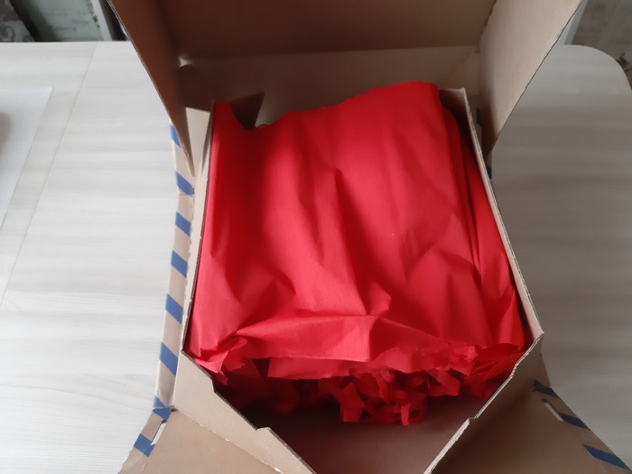 В большой коробке целый сугроб из красной гофрированной бумаги, которую используют для всяких поделок люди, у которых "руки из правильного места растут", есть у меня такая знакомая, будет ей тоже подарочек)