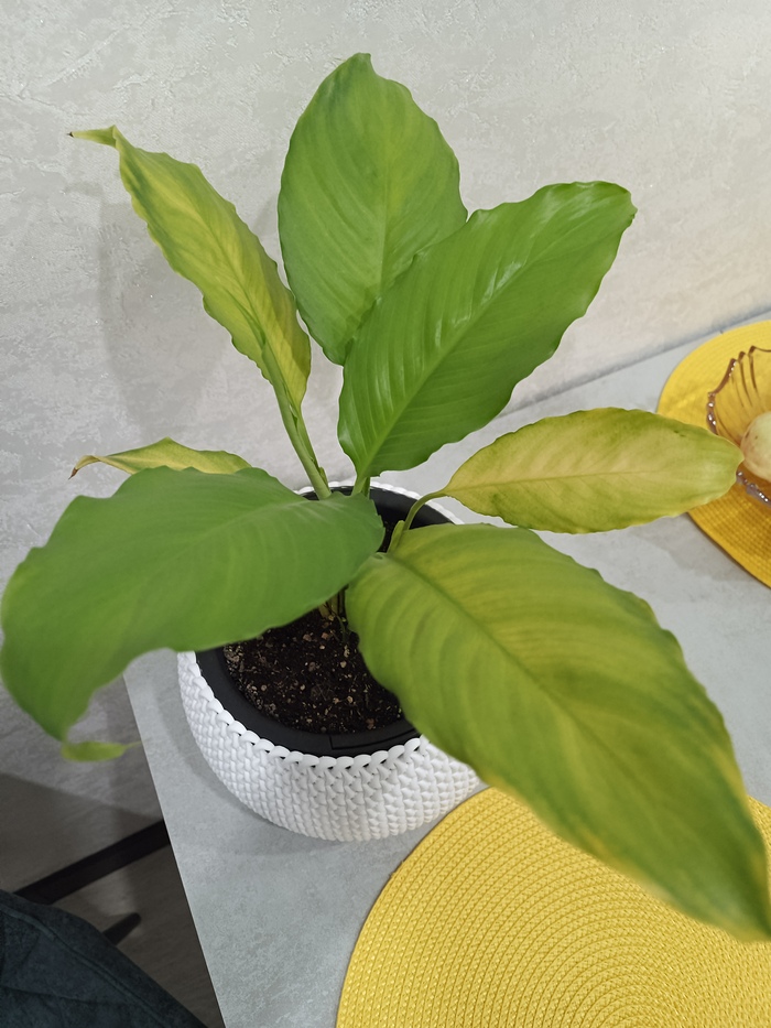 Товарищи, подскажите пожалуйста, почему стал желтеть цветок, удобрений не применяли, землю просто купили в магазине, чего ему, собаке, не хватает?