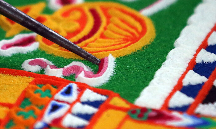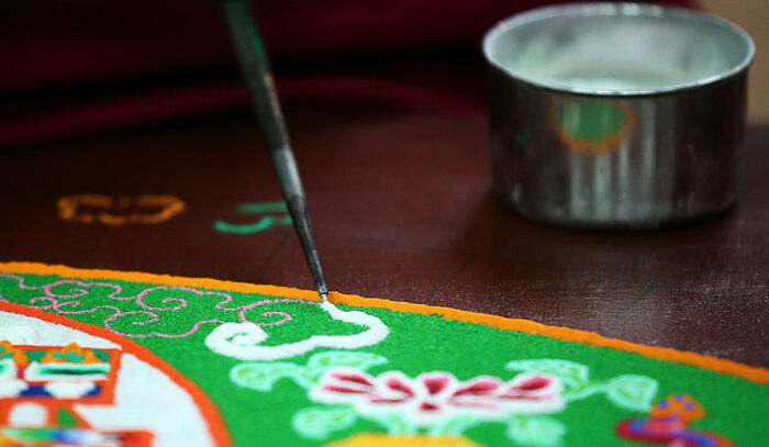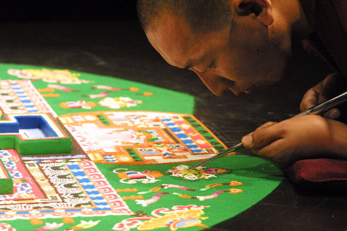 Благодаря этому жители Европы и России смогли увидеть широко распространенный в Тибете обряд строительства песочной мандалы. Вопреки распространенному мнению «строительным материалом» для дворцов просветления служит не цветной песок. Традиционно тибетские монахи использовали яшмы, малахит, кораллы и жемчуг. Сейчас им приходится заменять эти дорогие материалы более доступными, например, мраморной крошкой. Ее толкут в ступе, просеивают и окрашивают в разные цвета. Мраморные частички сортирют по размеру, а затем помещают в специальные чаши.