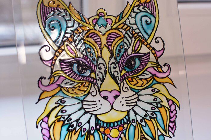 Привет! Сегодня хочу показать ещё один недавний орнамент, который нарисован на стекле витражными красками. Я долго думала над сюжетом, а потом вспомнила про всякие раскраски в стиле "мандала" с животными. Но чужие изображения брать не стала, кота отрисовала сама в Procreate. А потом, как обычно - сделала контур и залила разными цветами.