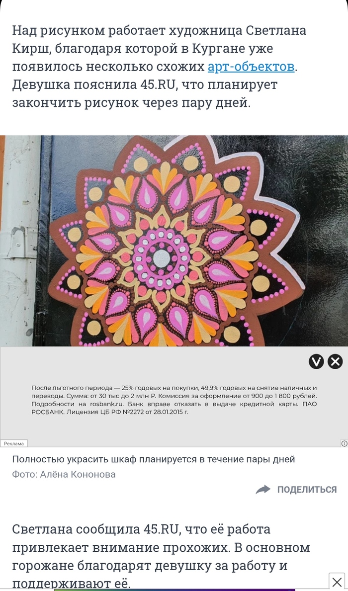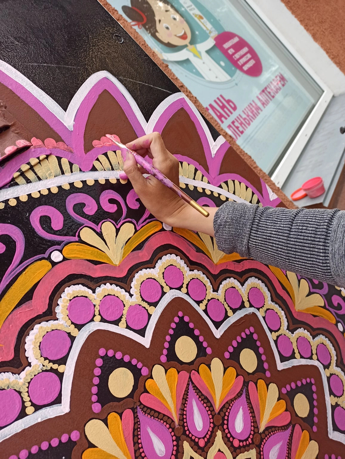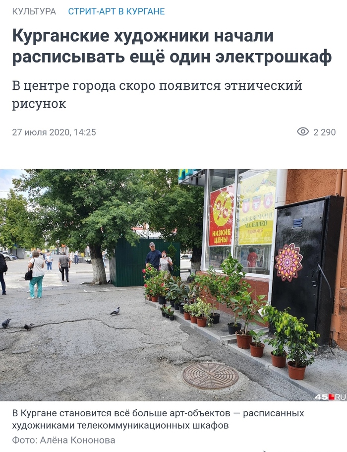 Это было, кажется, в 2020. Год назад стартовал проект "Арт-шкафы", мы с командой украшали город росписями на телекоммуникационных шкафах. Я расписала 4 из них, 2 авторские работы (герб Кургана и мандала) , и 2 работы, где я участвовала в качестве художника-исполнителя (Невежин и Фадеев).