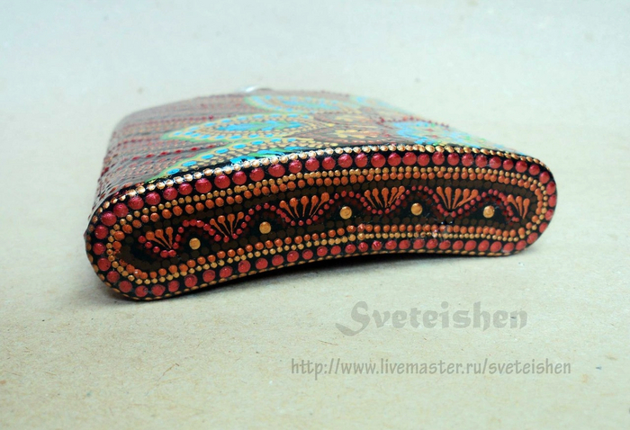 Свою точечную роспись я обычно рисую прямо из тюбика, выдавливая краску через тонкий носик, получая капельку краски. А тут для больших ровных кружочков пришлось использовать разные крышечки, по методу отпечатки.