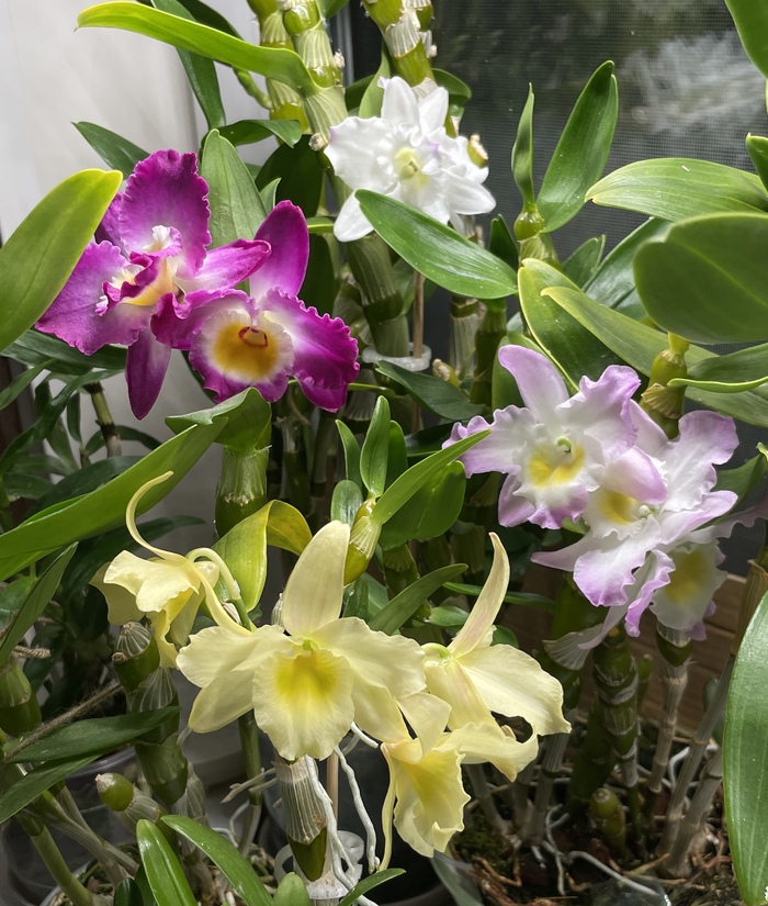 Это "полянка" гибридных дендробиумов Нобиле (Акацуки, Аполлон, Fancy Angel "Lycee" и Yellow Song 'Candy')