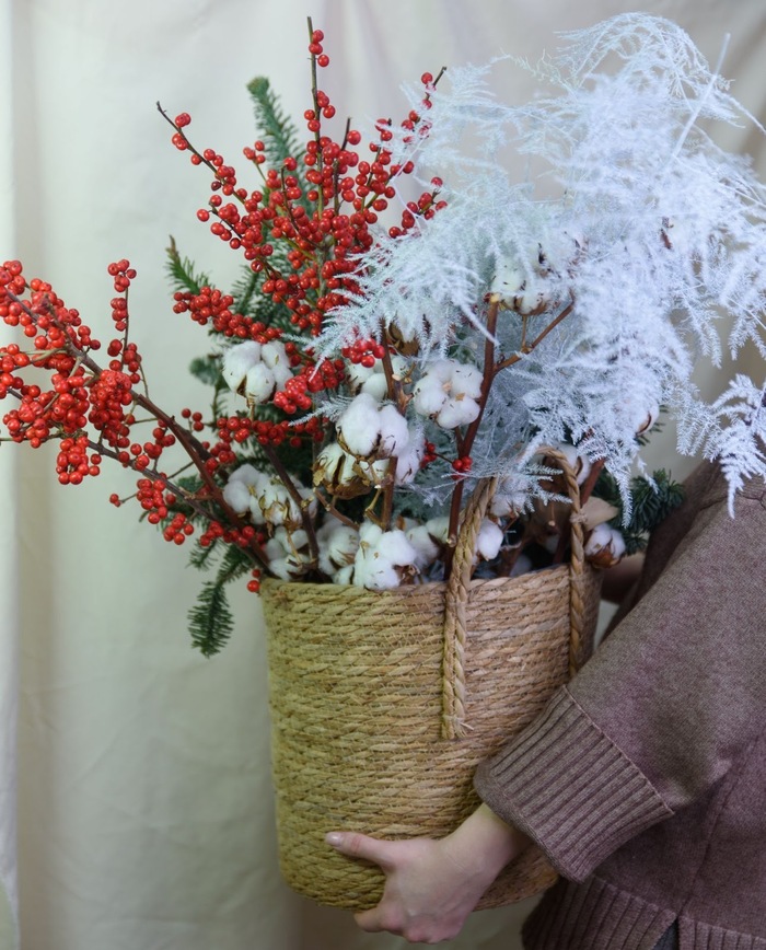 Новый год — хвоя, ветки, ягоды илекса и гиппеаструмы — графичность в букетах. Здорово, когда заходишь в салон и сразу чувствуешь: вот оно, время года. Это откликается и нам, и клиентам..