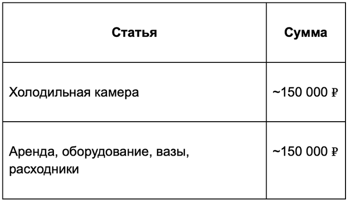 Открывалась я на 300 000 рублей. Большую часть съели два пункта: холодильная камера и первая аренда.