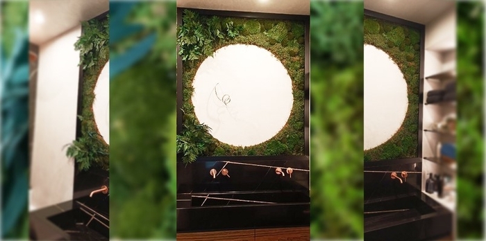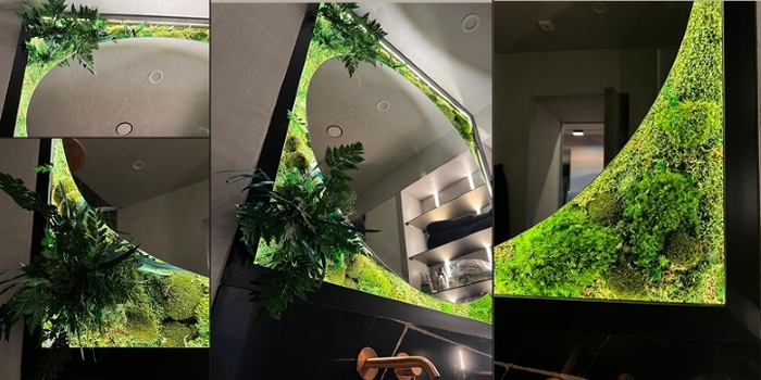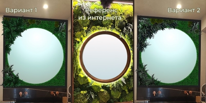 Завершающим аккордом стала установка зеркала и подсветки. По периметру ниши, с тыльной стороны зеркала и вдоль самого багета, проложили современную светодиодную ленту. При включении она создает волшебный эффект парящего в воздухе зеркала и мягко подсвечивает наше фитопанно, делая цвета мха и листьев еще более глубокими и объемными.