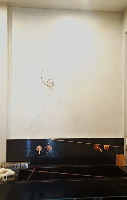 Чтобы упростить монтаж и избежать повреждений большого полотна, я собрала панно из четырех отдельных сегментов. Это гениальное решение позволило нам без проблем транспортировать композицию и легко установить ее в ограниченном пространстве ванной комнаты.