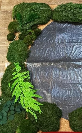 Пока решались вопросы с багетом, я приступила к самому приятному – созданию фитопанно. За основу взяла пробковую подложку – натуральный, легкий и долговечный материал. На ней я собрала потрясающую композицию из стабилизированного мха, нежного аспарагуса, веточек эвкалипта, ажурного папоротника и листьев хедеры.