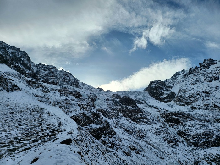 💪 Внушительная мощь ледника чувствуется издали, он словно замер среди горных отрогов, как широкий, пенный ледяной поток, зажатый в каменных тисках.