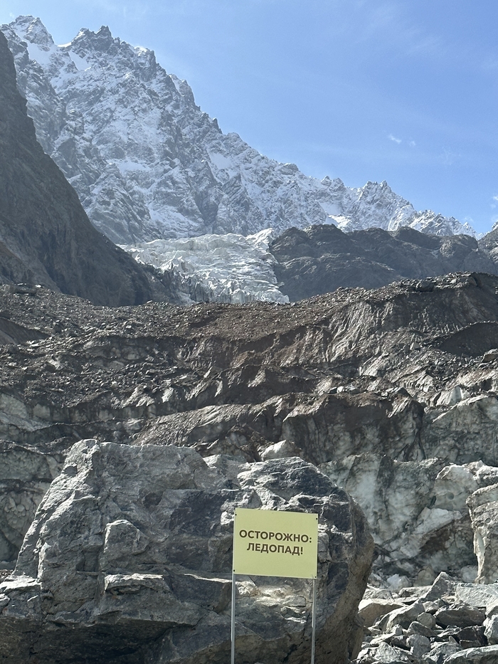 Пройдя 5км, мы подходим к языку ледопада, близко подходить не рекомендуется, кусочки льда и сыпухи все время осыпаются и слышен треск да падение очередного камушка, есть таблички. Ледник сверху серый и неприглядный.