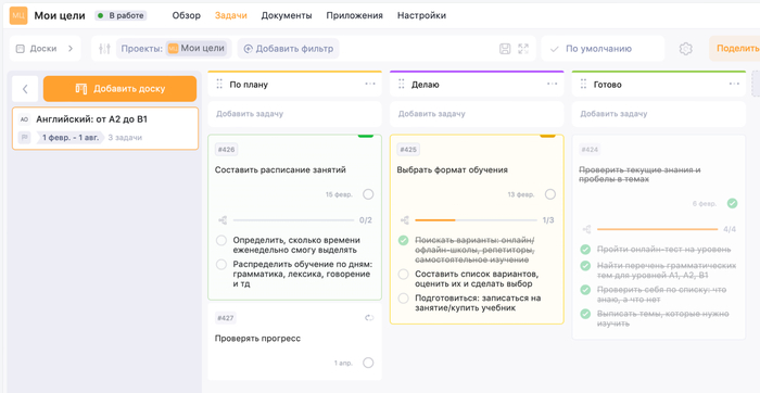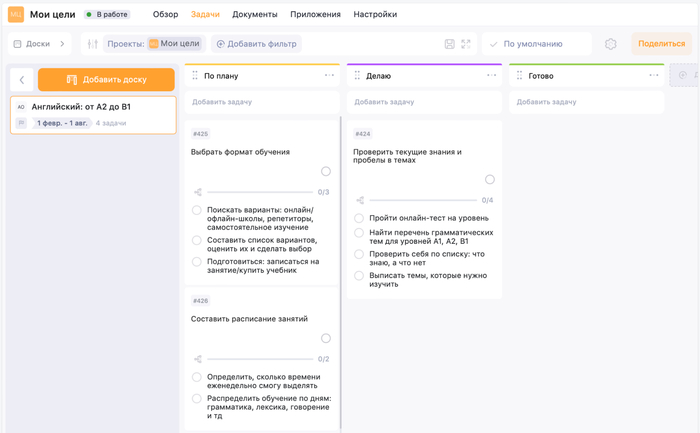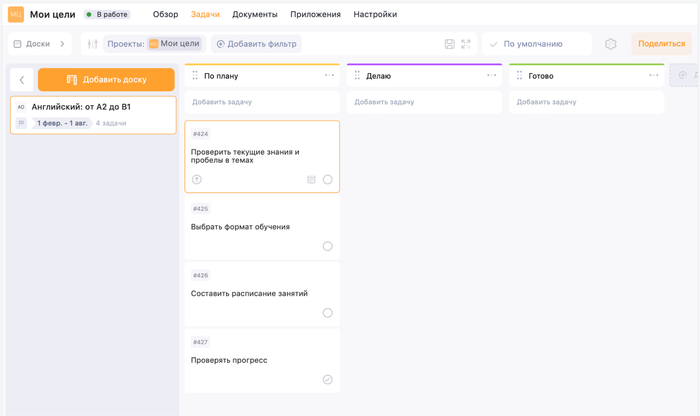 Создадим проект в таск-менеджере — пусть будет мои «Цели». Для каждой из целей сделаем свою доску — пока что у нас только «Английский: от B1 до A2». В настройках доски можно задать временной промежуток. Наши полгода начнутся с февраля.