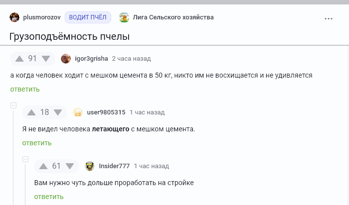 Муравей за раз переносит груз, который тяжелее его в 10 раз. Человек на стройке делает так же, но в несколько приёмов и громко матерясь