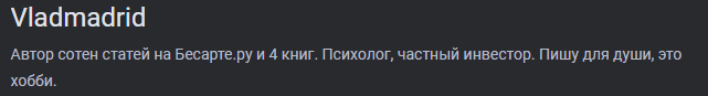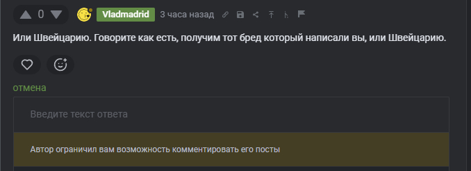 Но лучший пример как всегда преподнесла жизнь. Автор поста, автор сотен статей, психолог и частный инвестор, противник цензуры.... просто ЗАБАНИЛ меня за альтернативное мнение!