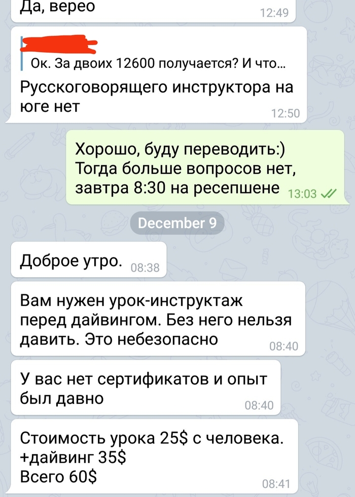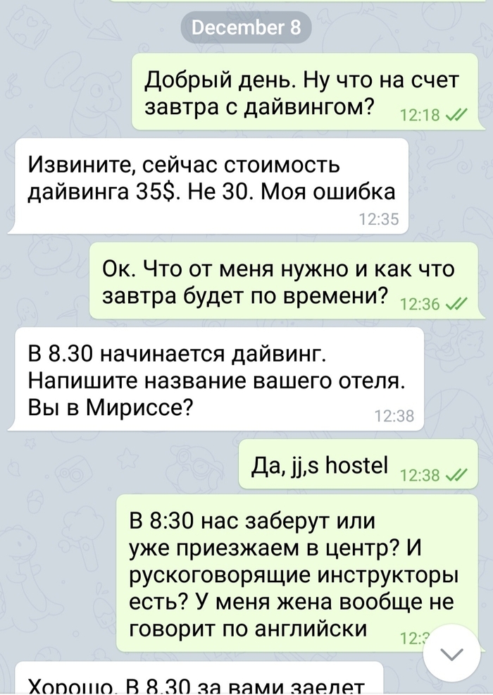 Но когда приехали на место, оказалось 35 это при наличии лицензии дайвера, а без нее 60. Конечно они начали торговаться, типа давайте за 50, потом ладно за 35. Но извините, дайвинг это не рынок, поэтому ушли. Только потом увидели, что уже постфактум девушка это все описала. К слову забрали нас с 8:32, примерно.