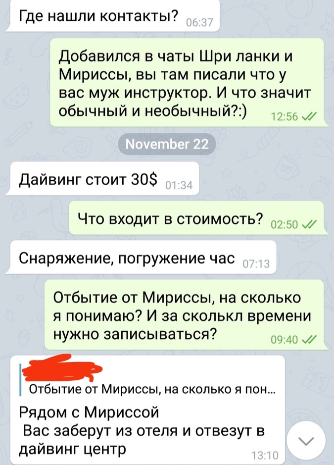 В Телеграмме нашел контакт русской девушки, которая живет на острове и чей муж, ланкиец, инструктор по дайвингу. Когда спрашивал первый раз, еще до приезда, цена была 30 долларов с человека.