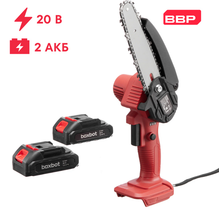 Компактная цепная пила с питанием от 20-вольтового аккумулятора. В наборе сразу два АКБ по 1,5 А·ч, есть зарядка и кейс для хранения. Цепь с шириной 11 мм и 36 звеньями. Скорость — до 5 м/с. Дополнительно в комплекте идёт запасная цепь.