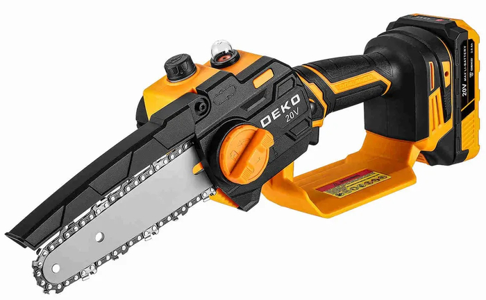 Бюджетный инструмент с AliExpress. Корпус прочный, сделан из АБС-пластика и металла. Поставляется с двумя аккумуляторами на 21 В (по 1200 мА·ч). Этого хватает до полутора часов работы. Мощность — 550 Вт, пильная шина длиной 10 см. Глубина пропила — до 10 см, скорость цепи — 5 м/с.