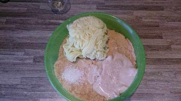 Замешиваем тесто из сырого и варёного картофеля, добавляем два яйца. крахмал из сока картофеля и муку, солим, перчим по вкусу.
