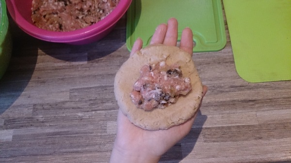 Делаем из теста шарики с кулак, разминаем руками в лепешки, в середину положить мясного фарша, защемить, придать форму цеппелинов.