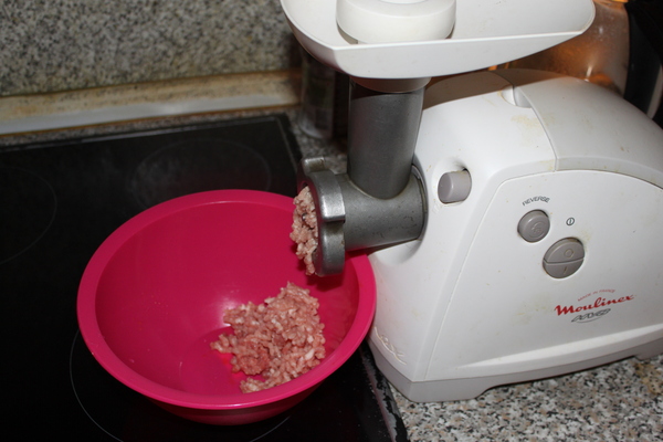 Пока варится, займёмся фаршем. Мясо, около 0,5 кг. и лук пропускаем через мясорубку, добавляем любимые специи, яйцо, солим и всё хорошо смешиваем.