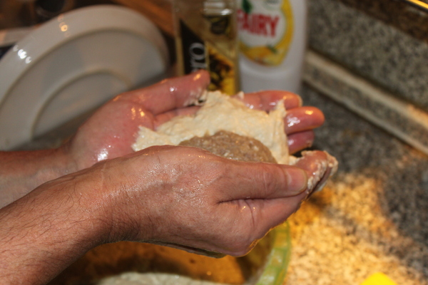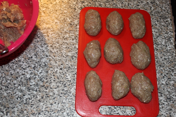 Смазываем руки растительным маслом, берём тесто и лепим типа пирожки с фаршем. Потом сразу опускаем в кипящую воду вариться на 25 минут.