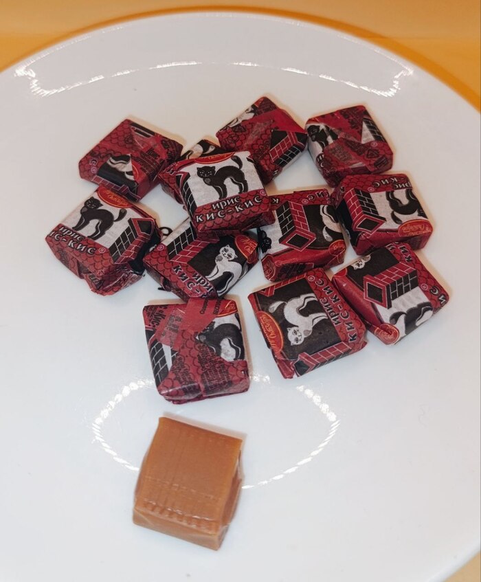 Это первый яркий флэшбек за этот обзор. Когда я попробовала откусить краешек ириски и наткнулась на "бетонную плиту", то в голове промелькнула одна мысль - надеюсь, мой врач-стоматолог вышла из декрета. Ириску нужно погреть в полости рта и через время она становится податливой и тягучей, цепляясь к зубам как за последний шанс выжить. Одну ириску я осилила, но другие брать боюсь, запасные зубы дорого стоят.