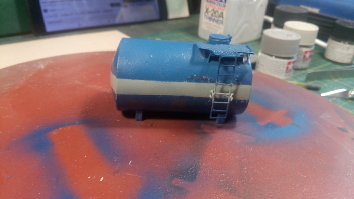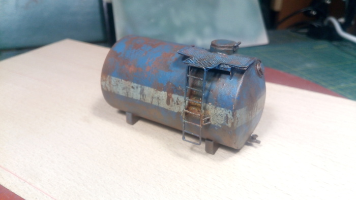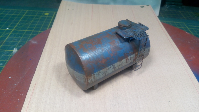 Далее окрашиваю цистерну в цвет ржавчины, использую краску "старая ржавчина, желтую, коричневую, серую и чёрные акриловые краски для получения оттенков ржавчины.
