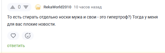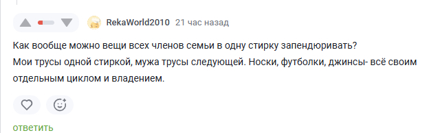 не, ну я стираю отдельно дедовы и сына одежду. Сын потому что вечно как порось марается и у него одежда погрубее она интенсивную стирку выдерживает. Батины вещи отдельно на максимальной температуре и с пропариванием потому что он старый и больной со всеми вытекающими в прямом смысле этого слова. А вот у автора комента трусы отдельно стираются причем каждого члена/нечлена семьи. то есть копятся грязные трусы какое-то время, отдельно складываются видимо (ибо им соприкасаться так понимаю даже в машинке нельзя, не то что "на воздухе") и тут мое воображение заканчивается. сколько же надо трусов чтобы сделать одну загрузку машинки. а если трусы разноцветные, это же весь дом в кучках/корзинках с грязными трусами. Не ну я думала у меня слишком много правил, но тут человек прям заморочился. А может это я неправильно стираю - по-старинке, раскладывая по цвету и типу ткани, а? И весь мир уже стирает по принципу принадлежности одежды? более того если верить автору комента, то все у меня совсем плохо. Пикабу познавательный или все-таки частный случай?