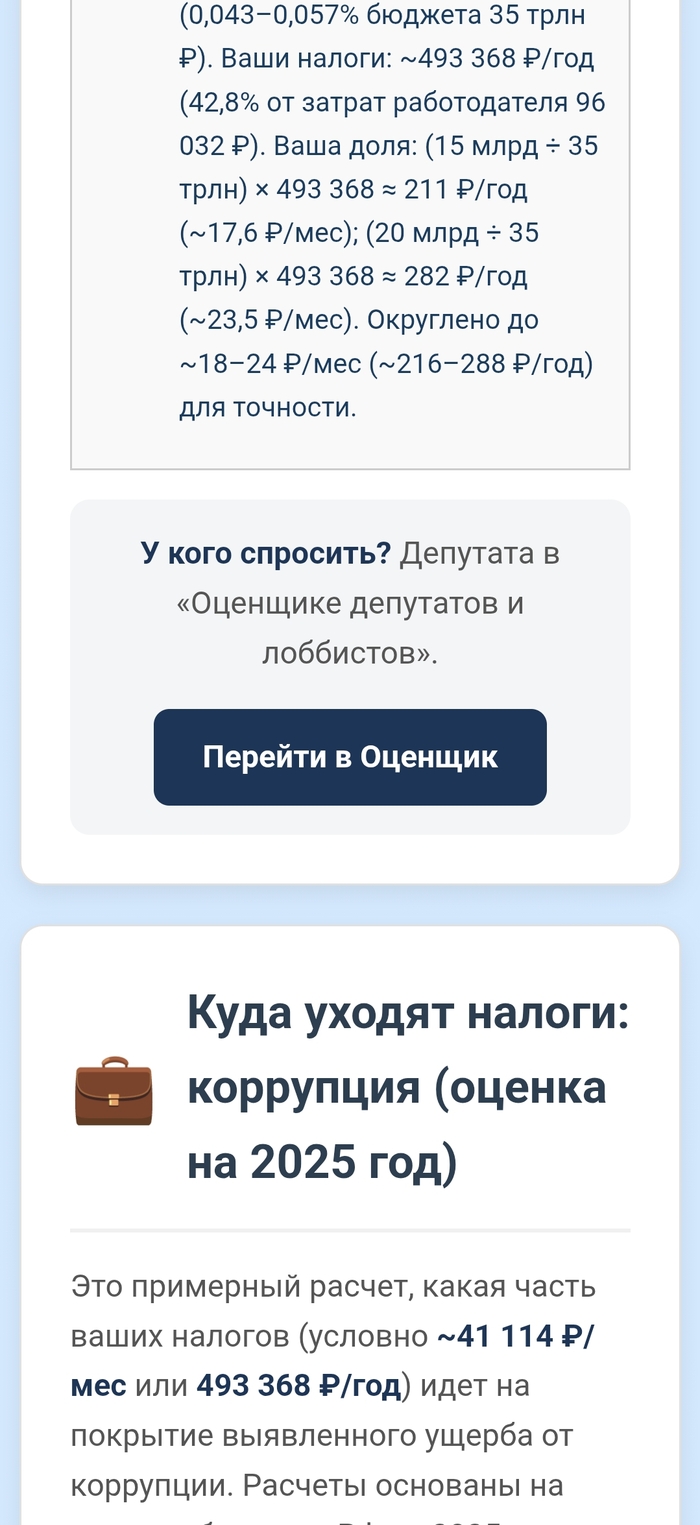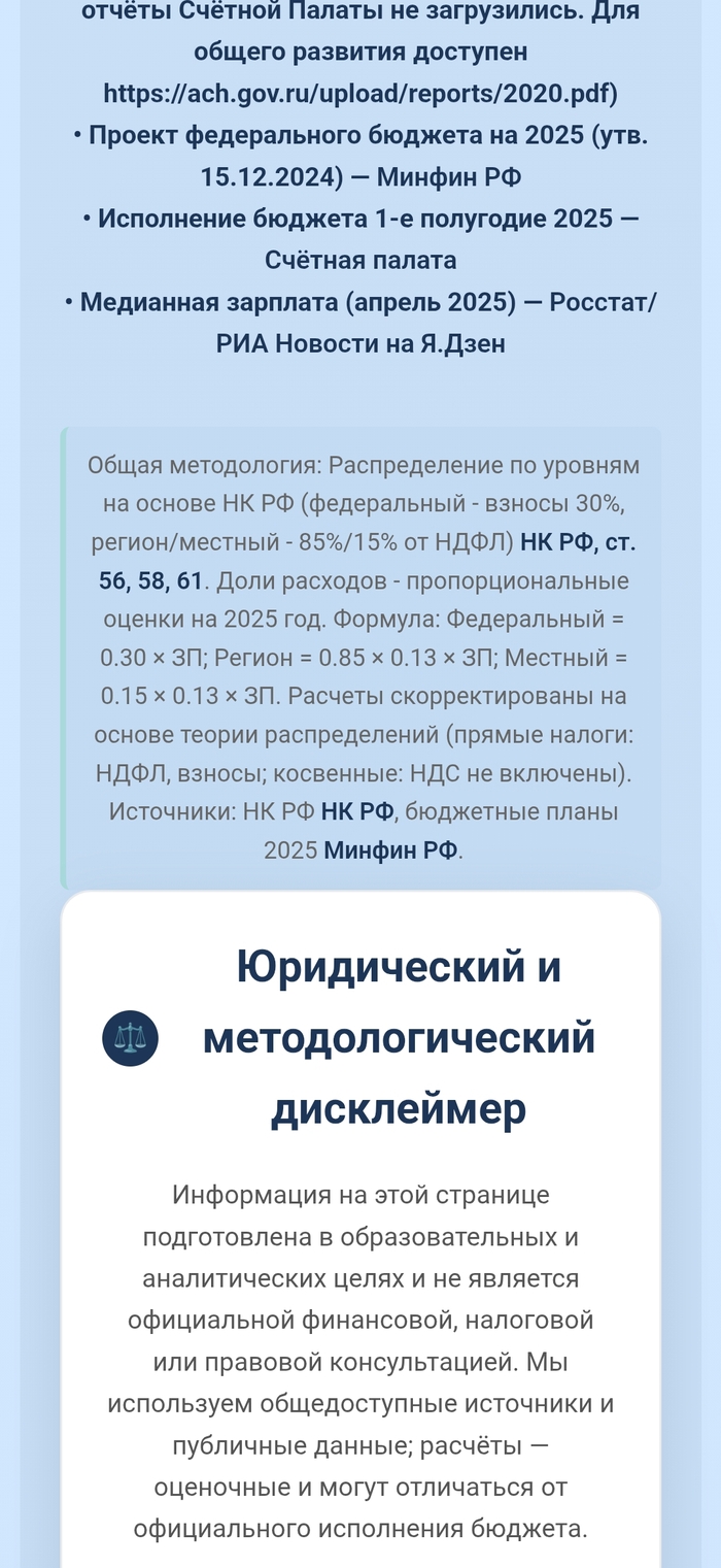 1.1. Оценочный и Образовательный Характер Данных: Данный инструмент является некоммерческим образовательным и исследовательским проектом. Все представленные цифры, расчеты и распределения (включая налоги, бюджетные статьи, зарплаты и ущерб) являются оценочными и получены путем моделирования на основе общедоступных данных. Эта страница не является официальным финансовым документом, налоговой или юридической консультацией.