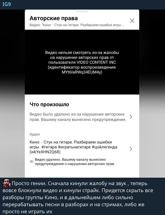 И вот на прошлой неделе он выложил мини-разбор песни "Стук" группы Кино. Я посмотрел, лайкнул, хотел вернуться к видосу позже, но... он исчез. А в телеге у гитариста появился пост такого содержания: