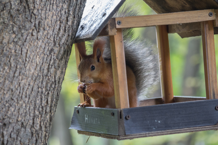 Тогда белки ещё не были настолько наглыми и к людям не подходили. Зато с удовольствием воровали еду из птичьих кормушек, к великому сожалению голубей и прочих пернатых. Ну и люди оставляли им там различных орешков.