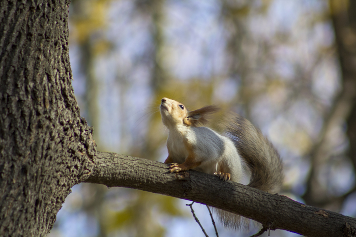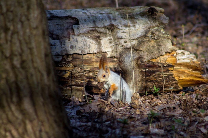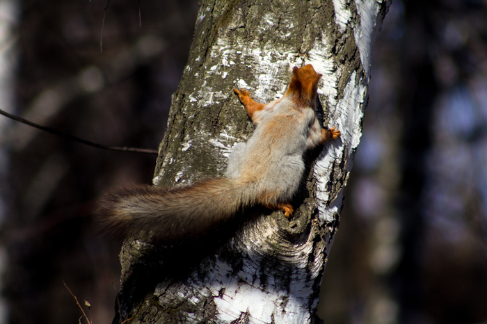 Здесь удалось поймать белку за полсекунды до прыжка. Вообще фотографировать их достаточно сложно. Ты на неё навёлся, а её уже там нет.